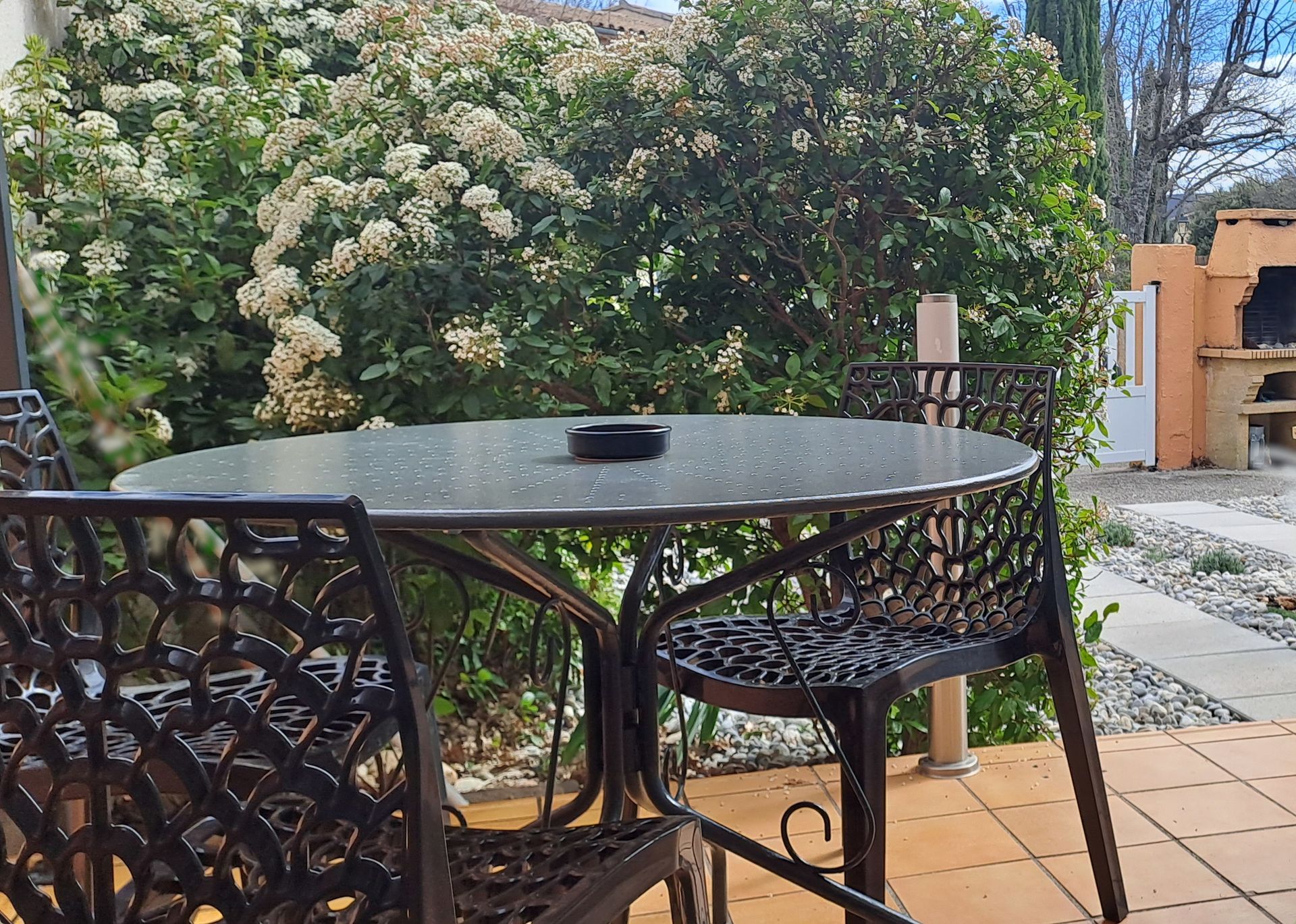 Portail d'entrée et barbecue commun.