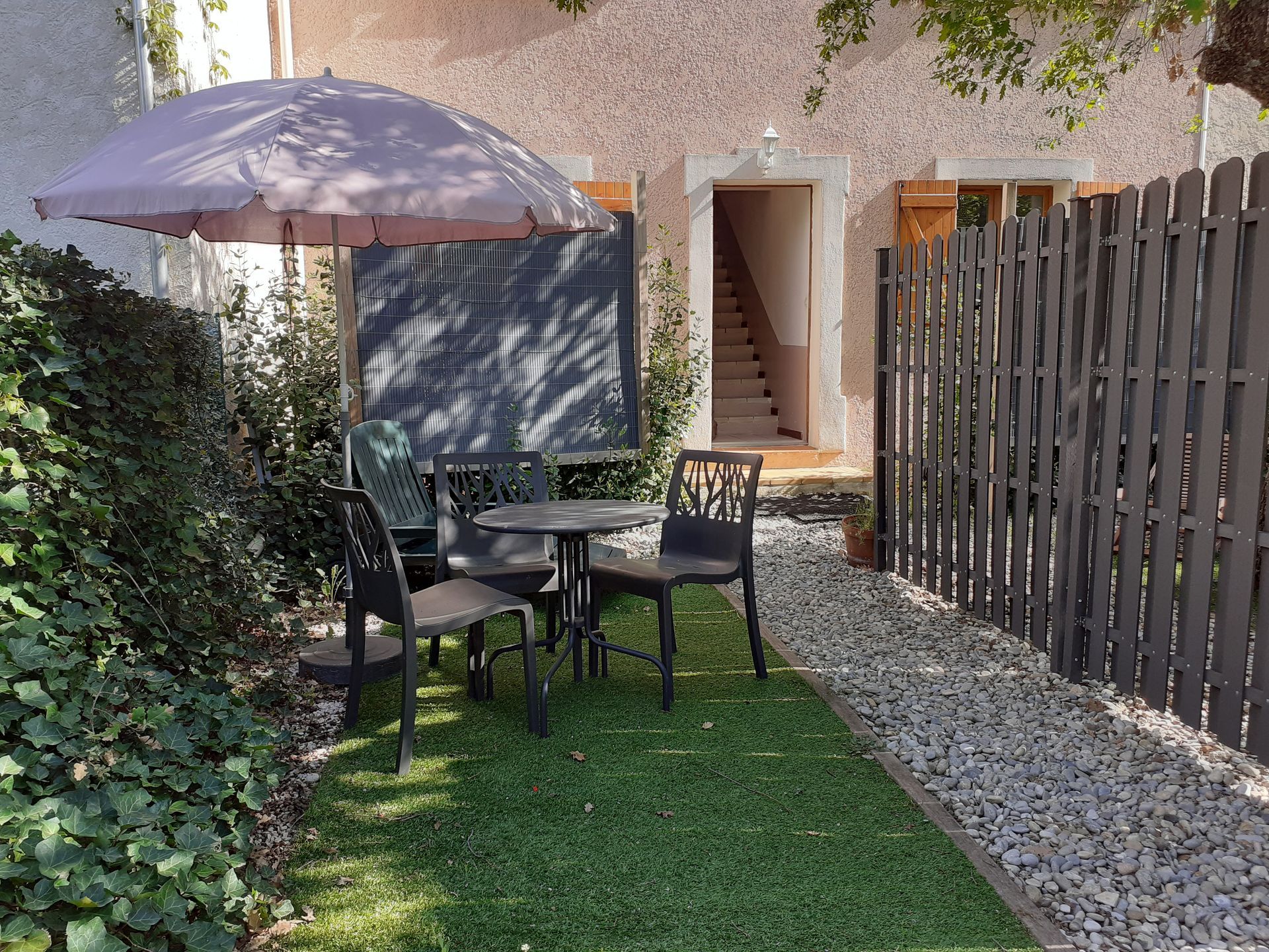 - Un jardinet extérieur par logement, séparé par un panneau en bois, avec petite table, chaises.